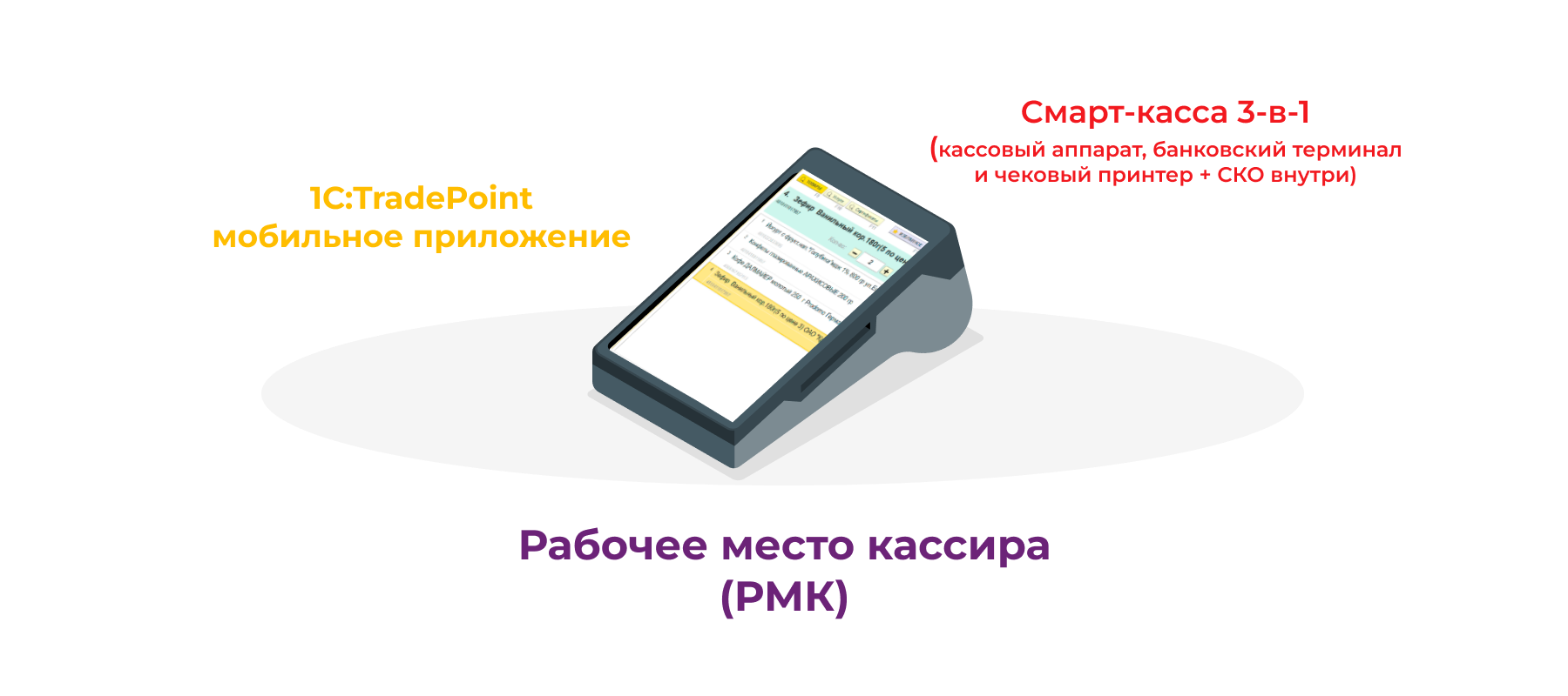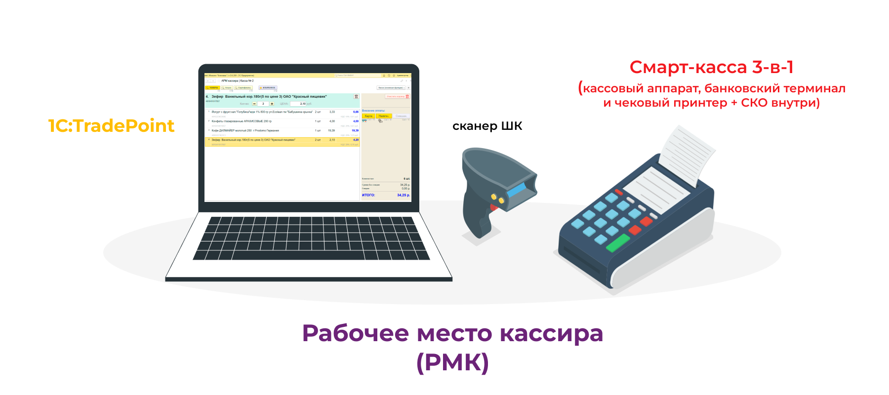 Понадобится: 1С:TradePoint + сканер штрихкодов + Смарт-касса 3-в-1.